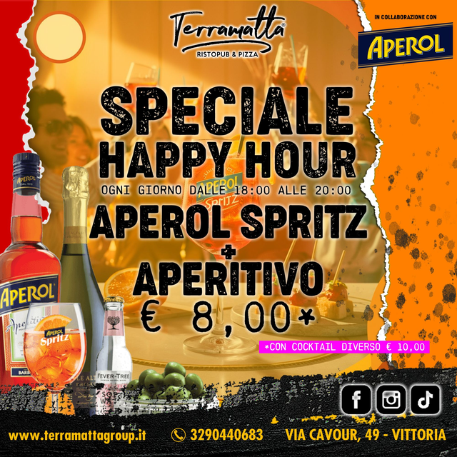 Ogni giorno dalle 18:00 alle 20:00 potrai gustare un Aperol Spritz accompagnato da un ricco aperitivo a un prezzo speciale di solo 8,00€.